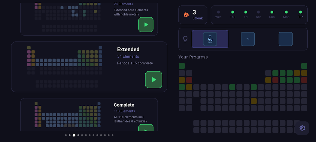 Statt trockener Karteikarten spielst du kurze Quiz-Level. Ein Element ist im Periodensystem hervorgehoben, du wählst das richtige Symbol, und deine Erfolgsserie wächst. Schnell, fokussiert und überraschend fesselnd.