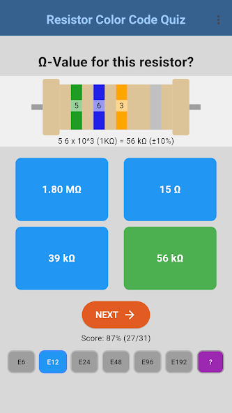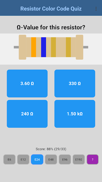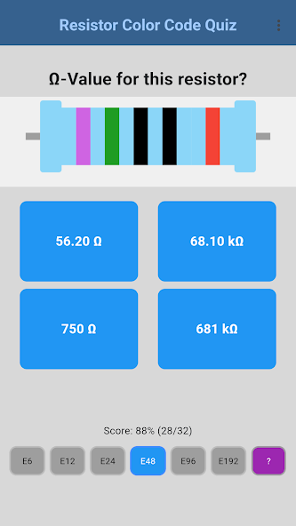 Widerstands-Farbringe richtig lesen üben. Quiz nach E-Reihen (E6 bis E192), mit Score-Tracking.